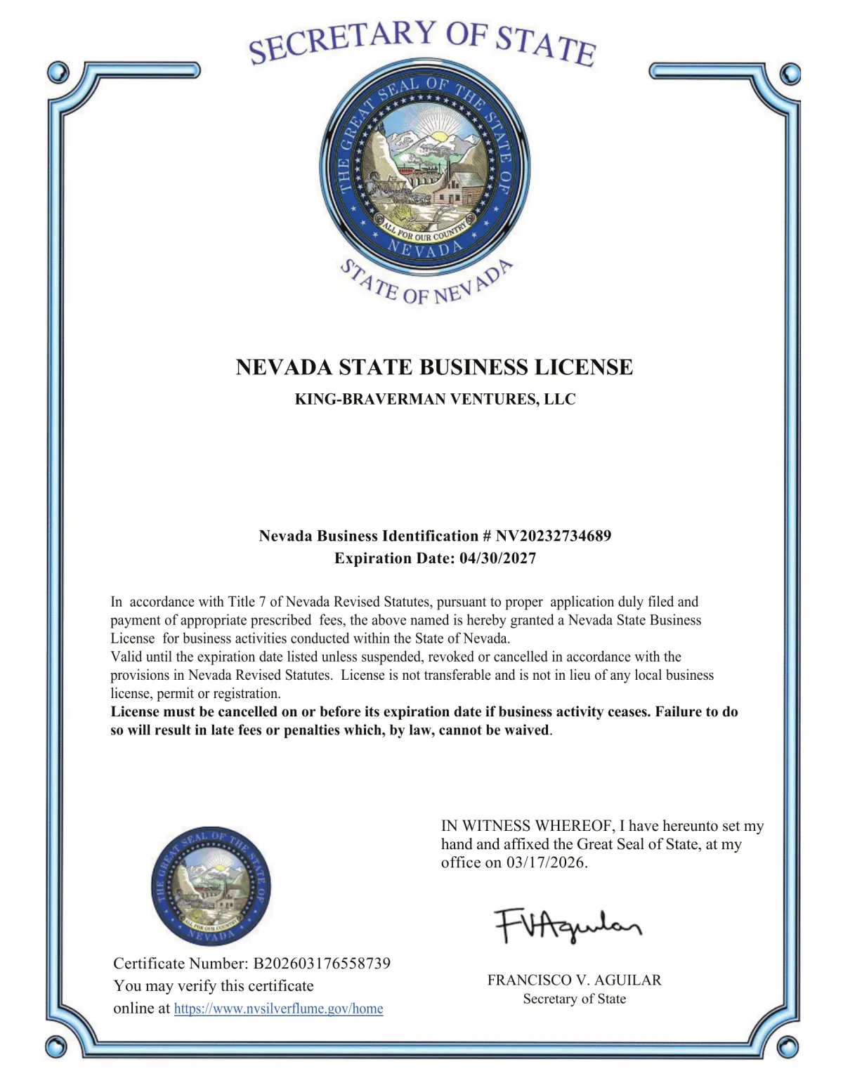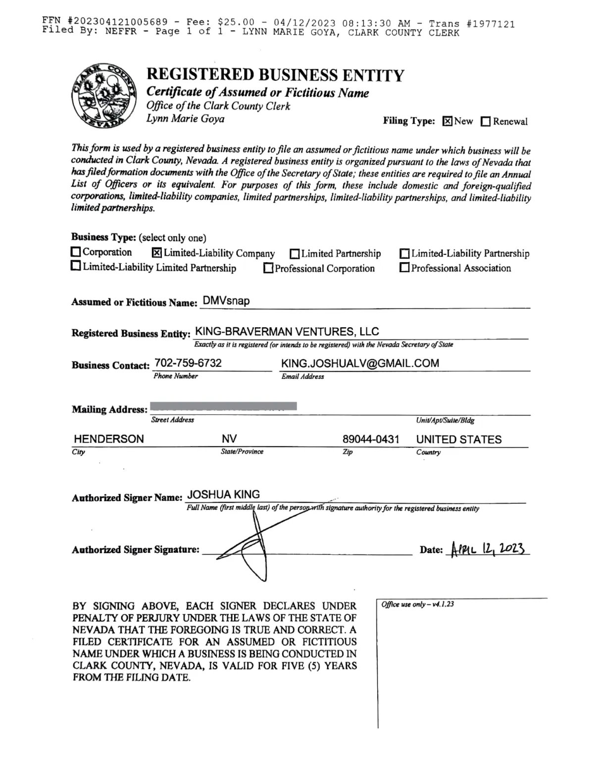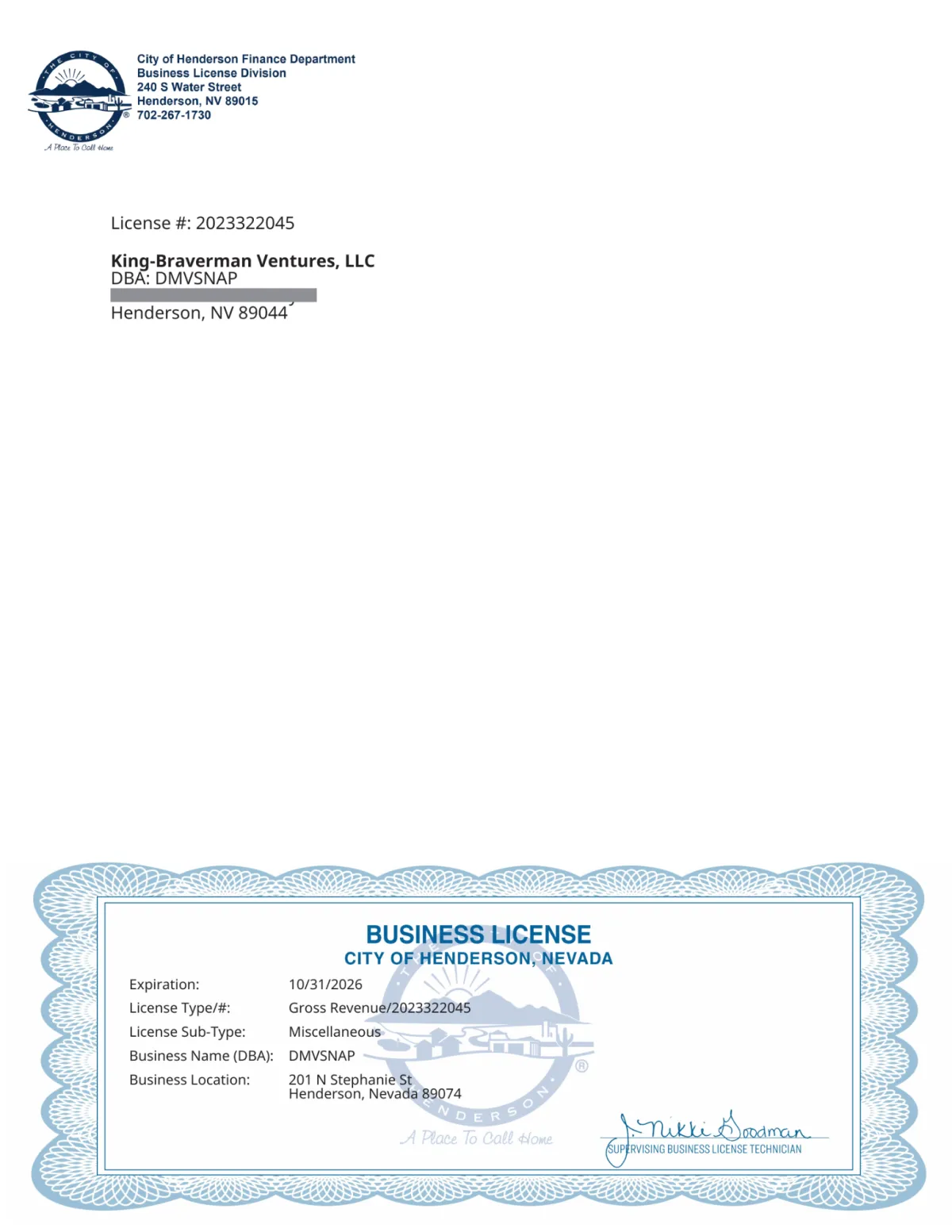 Legal Entity: King-Braverman Ventures, LLC Doing Business As (DBA) DMVsnap